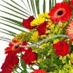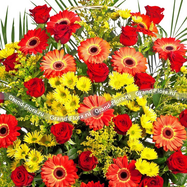 Стандартный (на фото): роза красная - 25 шт., гербера красная - 17 шт., хризантема кустовая желтая - 7 шт., солидаго - 10 шт., лист рабелини - 3 шт., салал, оазис, корзина.