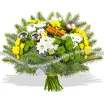 ДЕЛЮКС: хризантема желтая ромашковидная - 12шт., хризантема зеленая (сантини) - 8шт., хризантема белая ромашковидная - 10шт., еловая ветвь, корица, новогодний декор и зелень, сетка.
