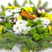 Уменьшенный: хризантема желтая ромашковидная - 2шт., хризантема зеленая (сантини) - 1шт., хризантема белая ромашковидная - 2шт., еловая ветвь, корица, новогодний декор и зелень, сетка.