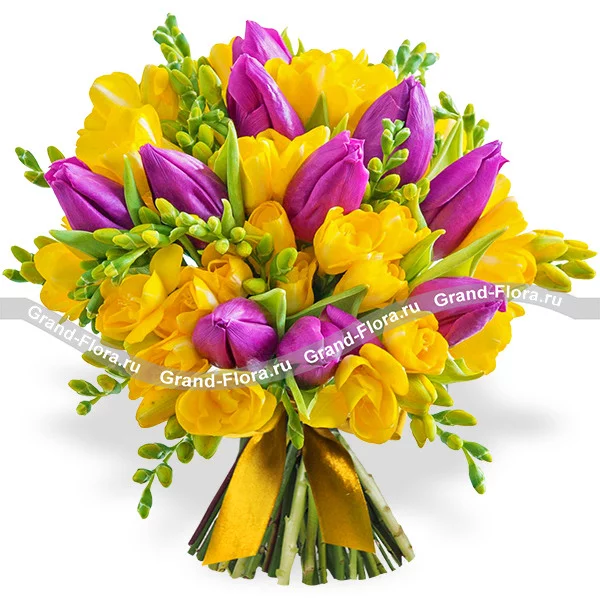 Стандарный: тюльпаны фиолетовые - 9 шт., фрезия - 12 шт., упаковка, лента.
